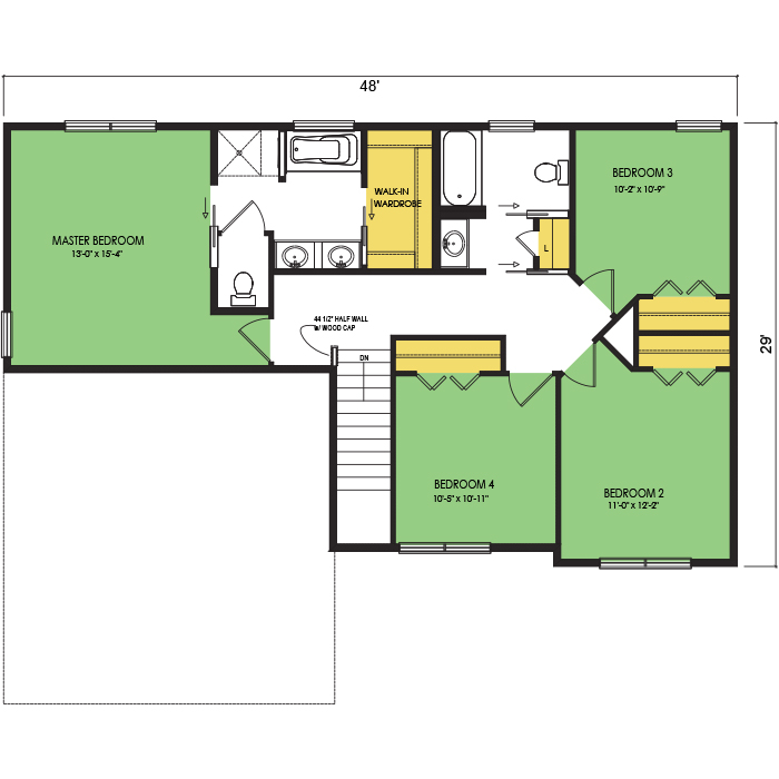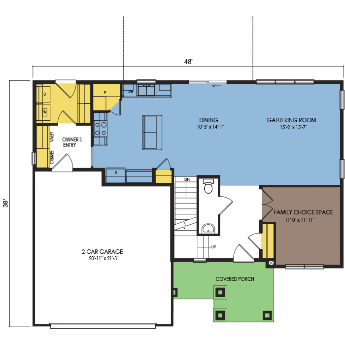 A part of our Dream Series, the Basswood 2-story floor plan features 4 bedrooms and 2.5 bathrooms, with a 2-car garage, a footprint of 48x36 feet, and 2189 total square feet of living space. Floor Plan #DR287