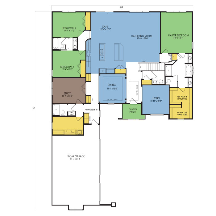 A part of our dream series, the tamarack floor plan features 3 bedrooms and 1.5 bathrooms with a foot print of 44x30 feet and 1342 total square feet of living space.