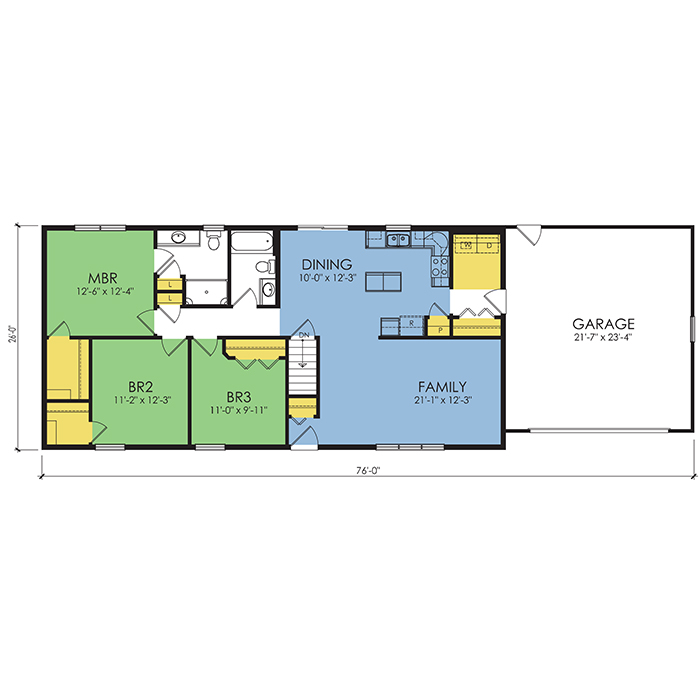A part of our dream series, the tamarack floor plan features 3 bedrooms and 1.5 bathrooms with a foot print of 44x30 feet and 1342 total square feet of living space.