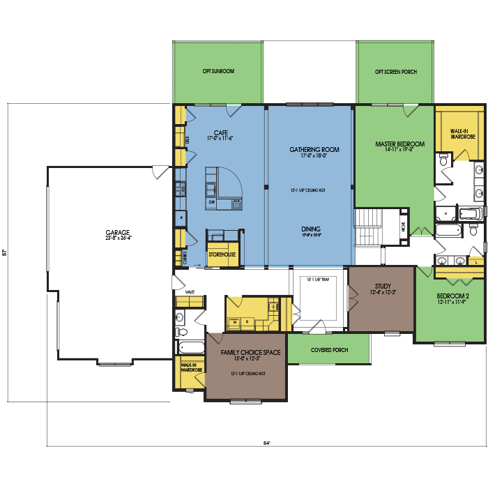 A part of our Vacation Series, the Geneva floor plan features 2 bedrooms and 3 bathrooms with a foot print of 84x57 feet and 2942 total square feet of living space. Floor Plan #VC187