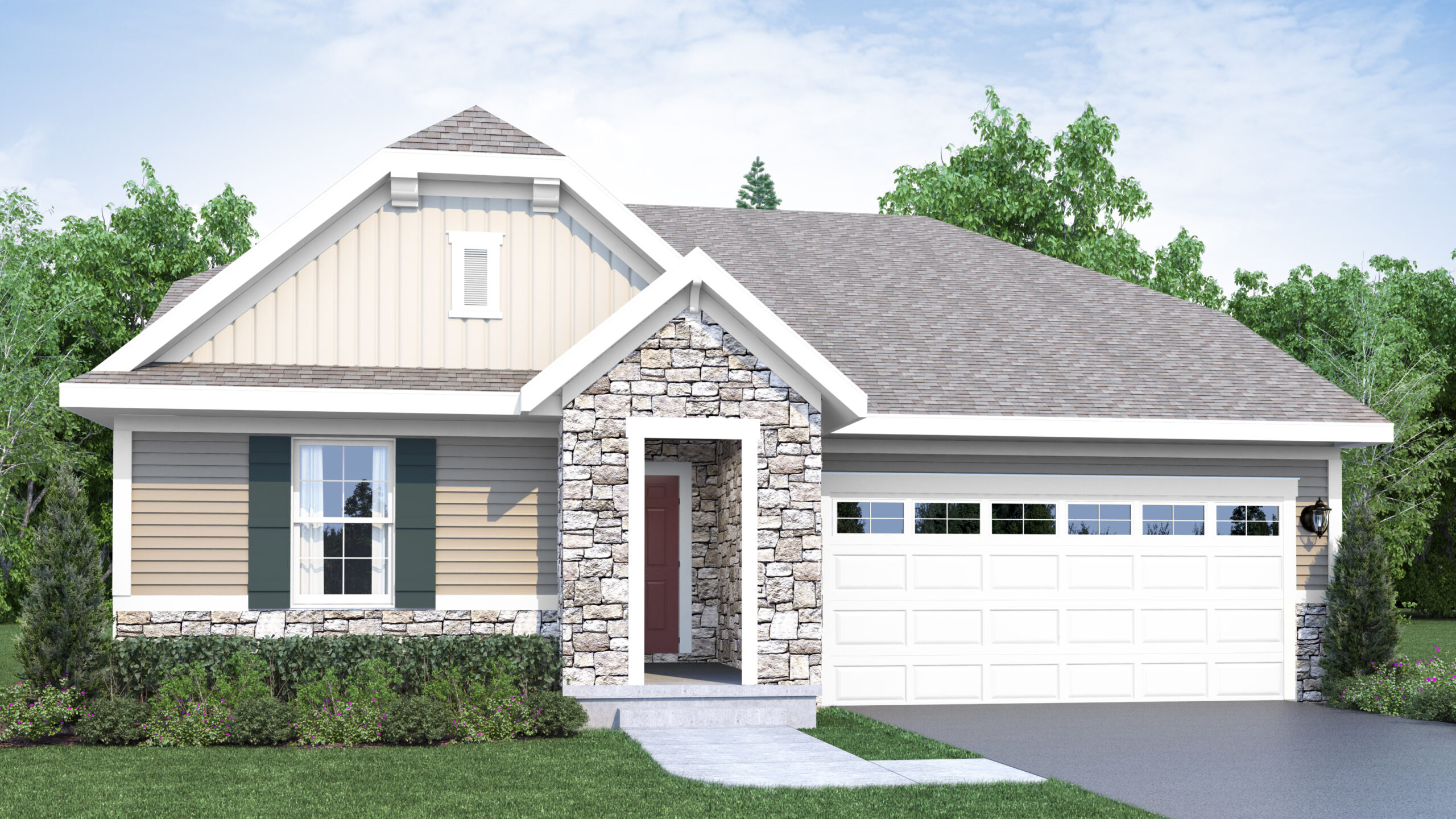 Exterior rendering of Mahogany 2 bed/2 bath floor plan from the front. Classical Exterior style. Classical
