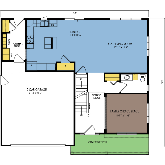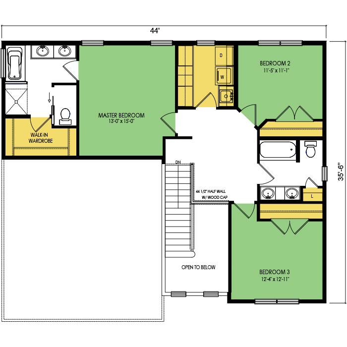 A part of our dream series, the tamarack floor plan features 3 bedrooms and 1.5 bathrooms with a foot print of 44x30 feet and 1342 total square feet of living space.