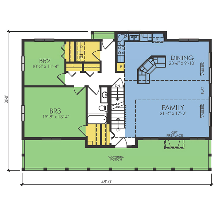 A part of our dream series, the tamarack floor plan features 3 bedrooms and 1.5 bathrooms with a foot print of 44x30 feet and 1342 total square feet of living space.