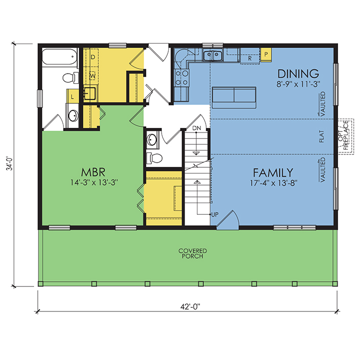 A part of our dream series, the tamarack floor plan features 3 bedrooms and 1.5 bathrooms with a foot print of 44x30 feet and 1342 total square feet of living space.