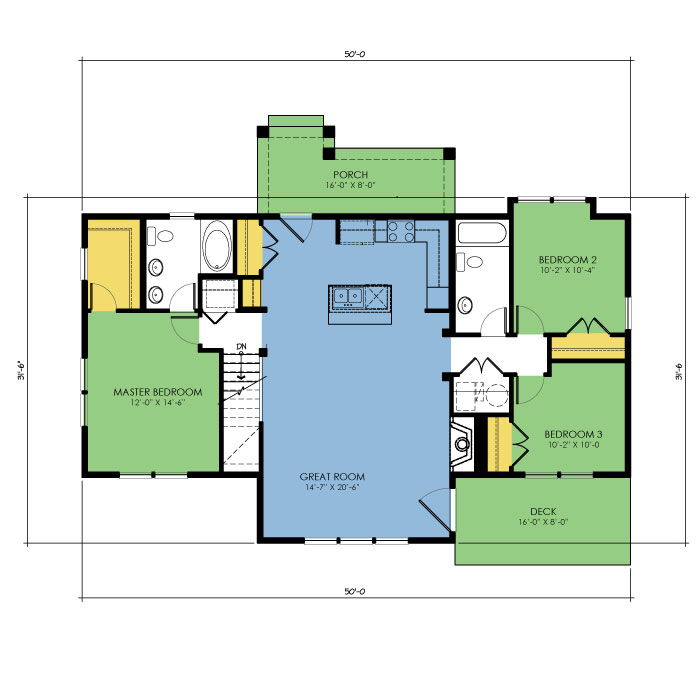 A part of our dream series, the tamarack floor plan features 3 bedrooms and 1.5 bathrooms with a foot print of 44x30 feet and 1342 total square feet of living space.